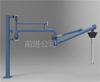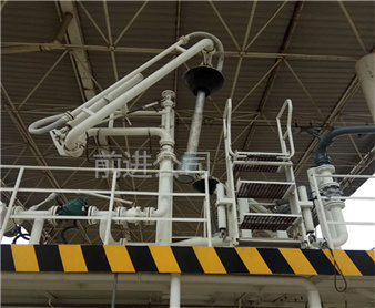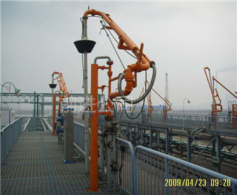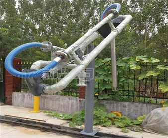 密閉式頂部裝卸臂由5個(gè)旋轉(zhuǎn)接組成回轉(zhuǎn)**,液相4個(gè),氣相1個(gè)。氣相一般為DN50,液相根據(jù)客戶需要的流量選擇。氣相在轉(zhuǎn)接處使用金屬軟管連接,保證鶴管的旋轉(zhuǎn)靈活性。鶴管液相接口朝下,氣相接口朝上,一般氣相會(huì)多臺(tái)匯總在一個(gè)主管上,如果單臺(tái)排空的話,需要加帶雨帽的阻火器,**管道進(jìn)入點(diǎn)燃源。垂管上有一個(gè)錐形密封帽,裝車時(shí)垂管插到槽車的頂部灌口,密封帽壓實(shí)在灌口處,鎖緊外臂鎖緊桿(或者氣缸壓緊,在和油氣回收配合使用時(shí),建議鶴管增加氣缸,達(dá)到充分密閉的作用,因?yàn)榭盏牟圮囋谘b車時(shí)物料逐漸增多,槽車輪胎壓扁,槽車降低,密封帽就不能很好的密封了,必須有氣缸對(duì)密封帽有一個(gè)壓力,才能使密封帽始終跟緊灌口。達(dá)到有效密閉的效果,油氣回收需要密閉效果達(dá)到90%-95%)密封帽密閉后,槽車?yán)餁饣慕橘|(zhì)就能通過(guò)鶴管上的氣相管道排空或者抽入油氣回收系統(tǒng)
